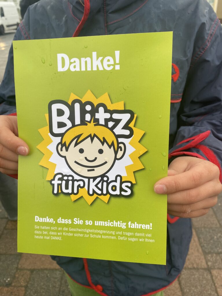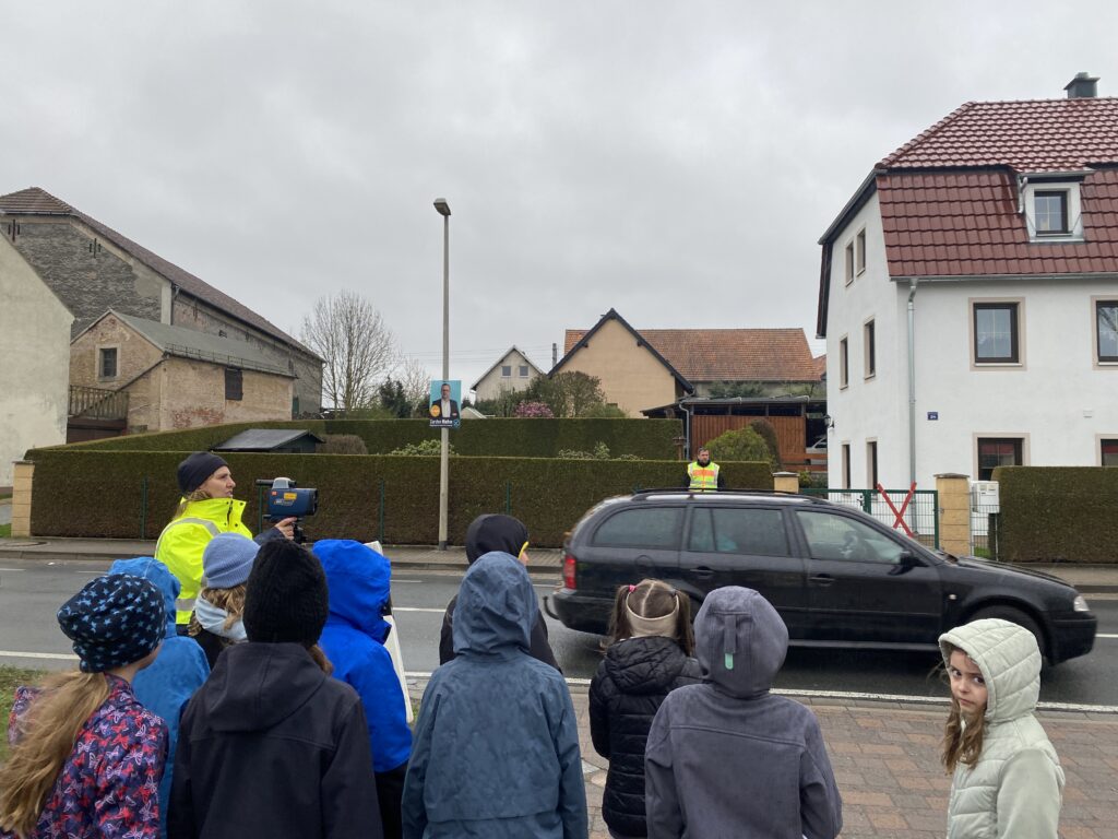 Am Montag, den 20. April 2026 kam die Polizei Freital für die Aktion „Blitz for kids“ zu uns an die Evangelische Grundschule Grumbach. Dazu sind wir zur Feuerwehr gegangen, da ist die Geschwindigkeit auf 30 km/h beschränkt. Die Polizisten winkten einige Autos heraus. Einige Fahrerinnen und Fahrer sind zu schnell gefahren, andere haben das Tempolimit eingehalten. Es wurde bei allen die Fahrzeugpapiere, der Führerschein, das Warndreieck, die Warnweste und der „Sanikasten“ kontrolliert. Wer alles vorweisen konnte und gut gefahren war, hat eine grüne Karte erhalten und wurde von uns Kindern gelobt. Allen anderen verteilten wir gelbe Karten und wir durften die Erwachsenen ermahnen. Zum Glück fuhren nur wenige zu schnell. Diese Aktion hat uns viel Spaß gemacht!