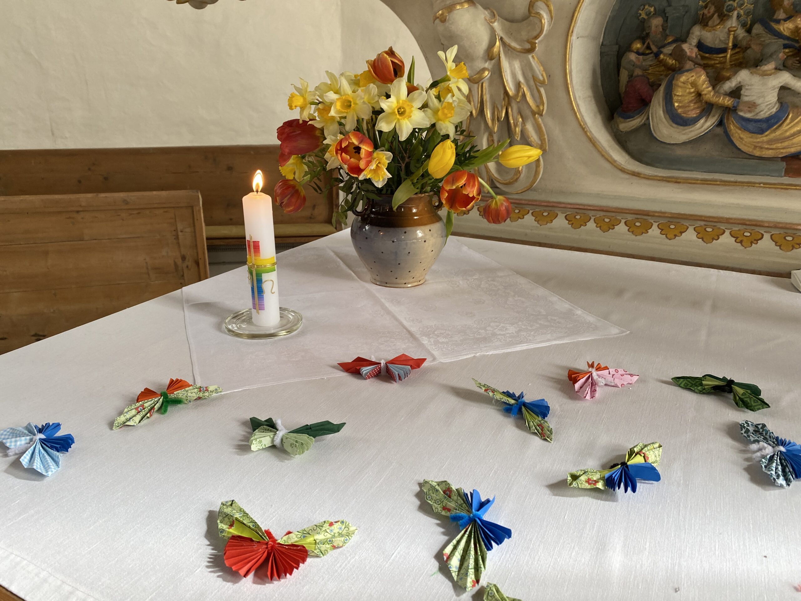 Direkt nach den Osterferien sind wir mit einem Gottesdienst in den neuen Schuljahresabschnitt gestartet. Wer die Kirche an dem Vormittag des 8.4. betrat, konnte sofort das Thema des Gottesdienstes erahnen: Schmetterlinge! Überall im Kirchraum klebten bunt bemalte und filigran gefaltete Exemplare. Diese hatten die Kinder bereits vor und in den Ferien gestaltet.